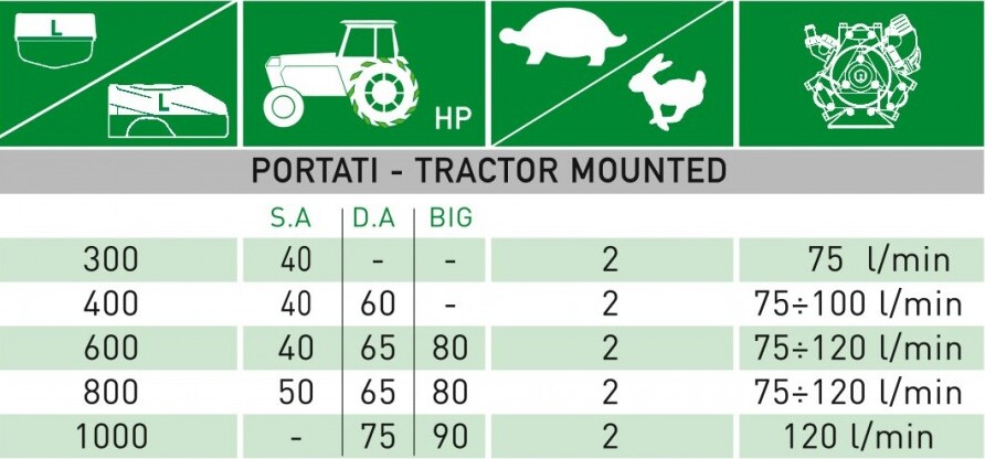 Turbine “P” 600 л, насос 100 л/мин, турбина 430 DA, распыление горизонтально до 32 м, вертикально до 25 м, необходимая мощность трактора 65 л.с.